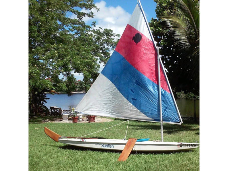 1982 Sunfish sail boat with or with out trailer. The boat is in excellent condition for age. no cracks or patches, boom, mast,tiller,center board all in very good condition, the sail has some tap on it when I bought it, still fast in strong wind, rigging good have some new not installed yet. New trailer, boat cover mast and boom bag, new