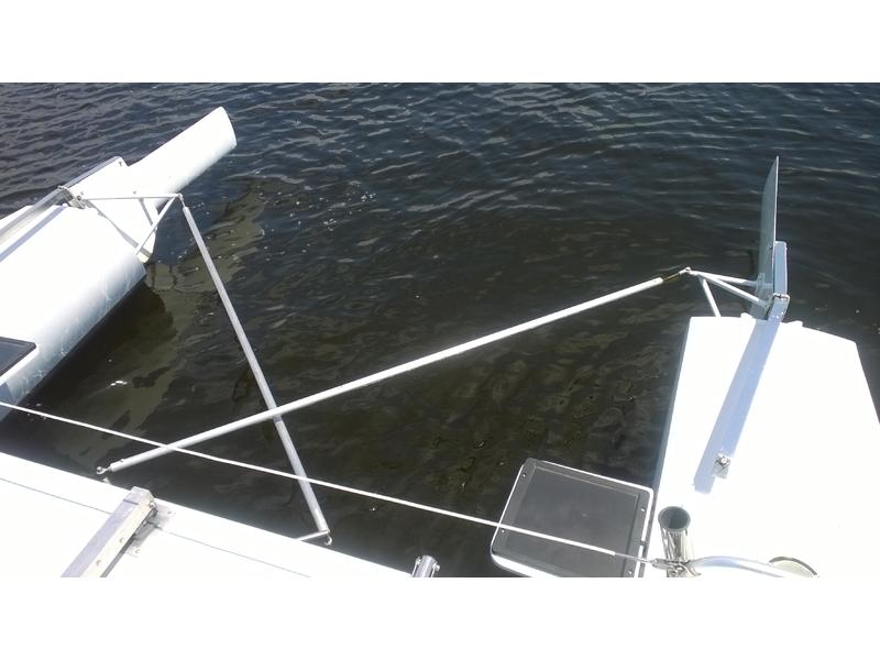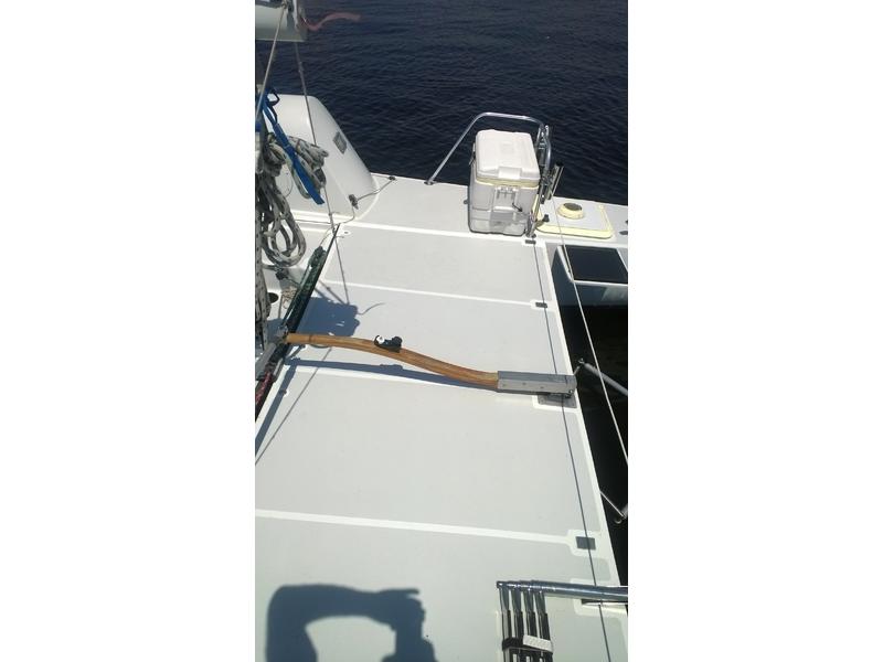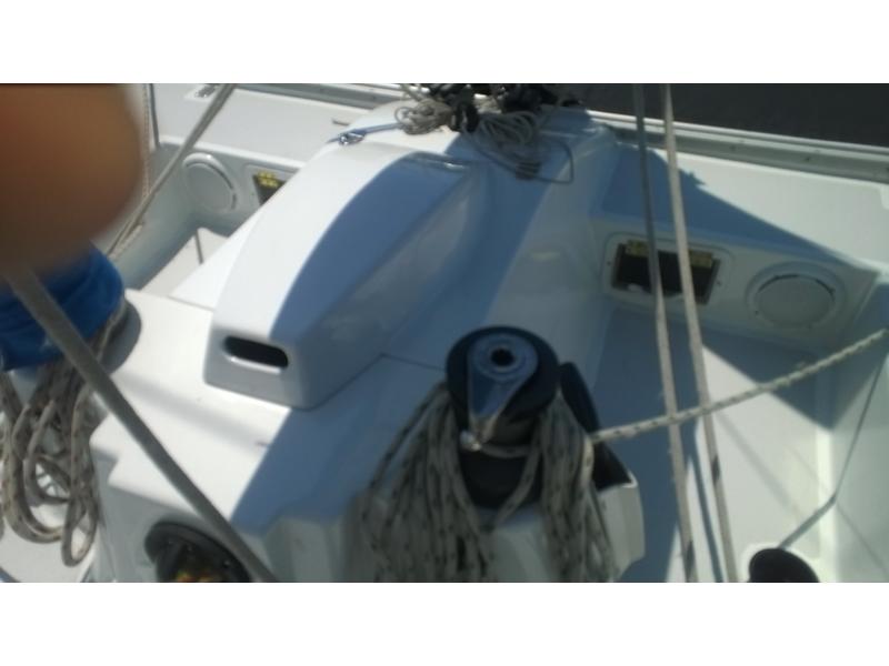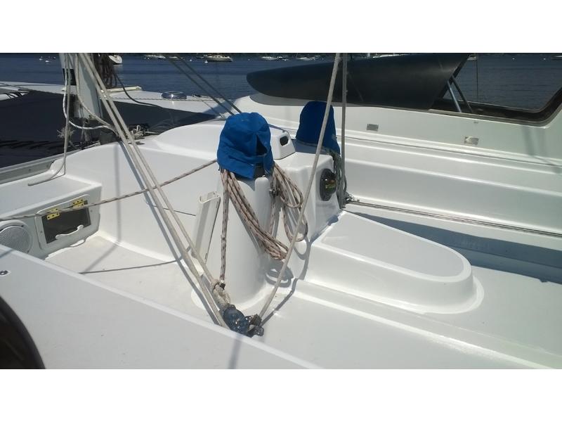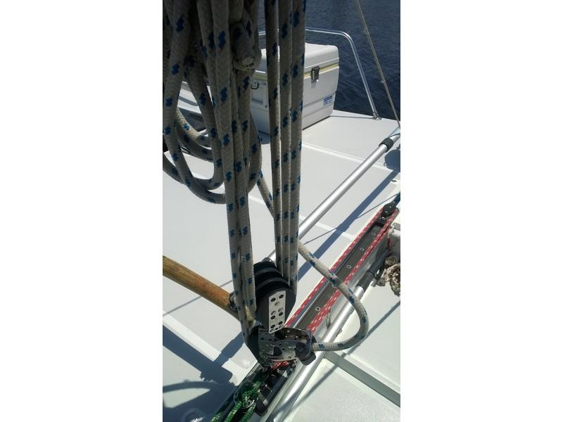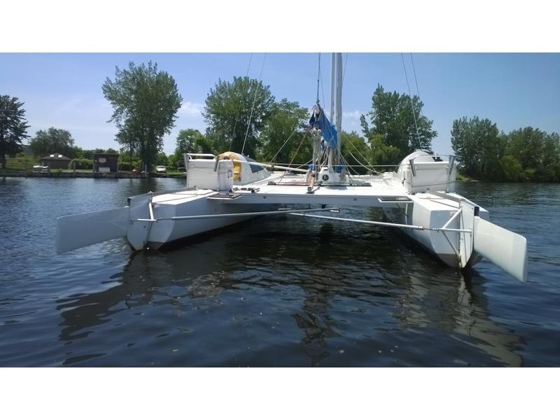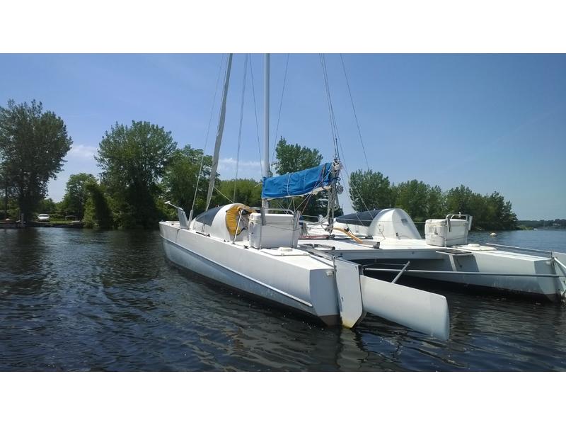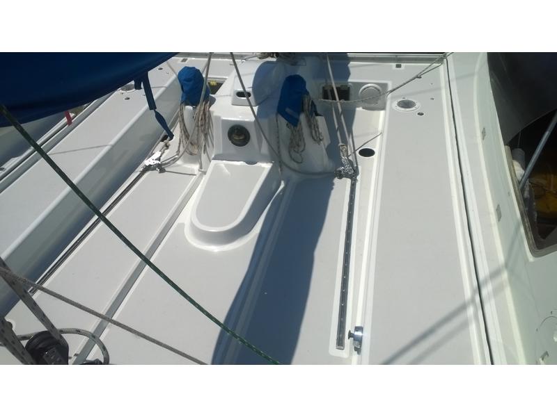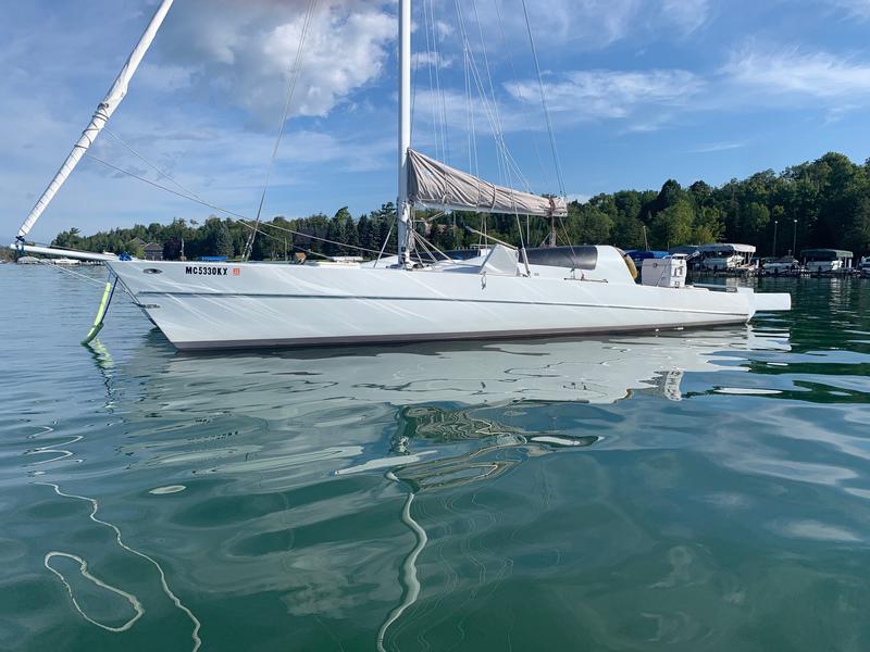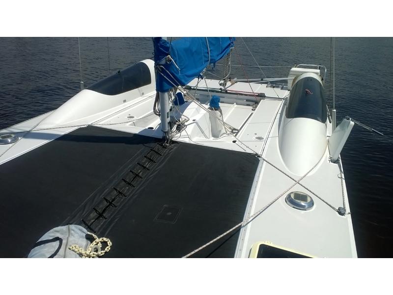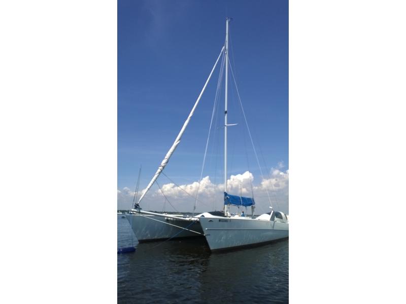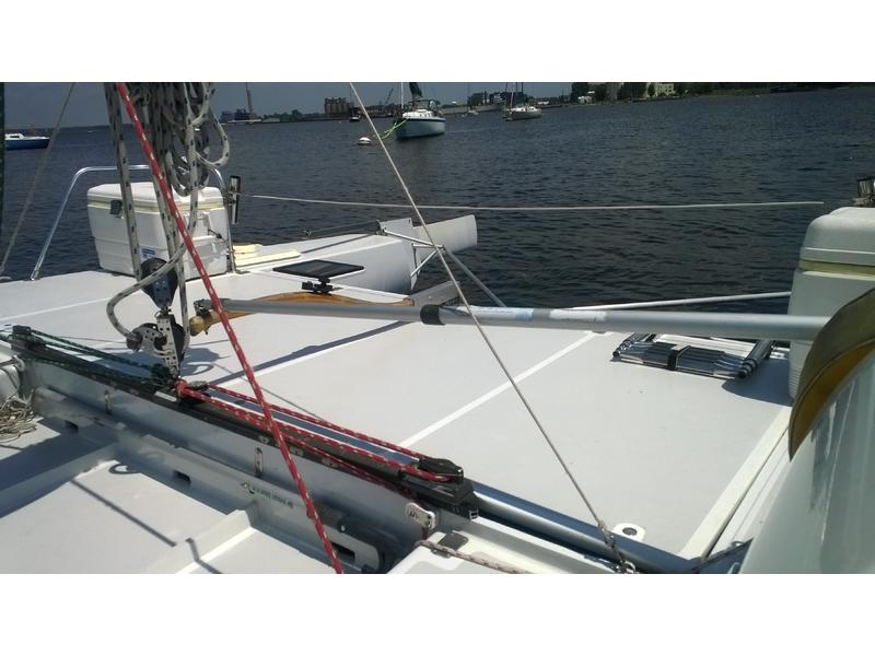 Mast F-28 rotating. front beam 6" telescoping aluminum 8'bow sprit. Sail inventory: Custom main by Saber, Screach(roller furler), 2 Genoa, 1 Jib, & storm Jib. running back stays. Harken self tailing wenches,Harken Big boat main traveler and 7:1 mainsheet, Ship to Shore radio, Stereo. Custom ultralight interior. Thetford Porta Potty, bunk and deck cushions,2-50 Gallon cooler seats, LED Running lights, compass. Dagger Board thru haul. 2 DC Batteries 2 solar panel chargers,2 day/night solar vents, Harding Trailer with mast raising system, new tires road worthy.