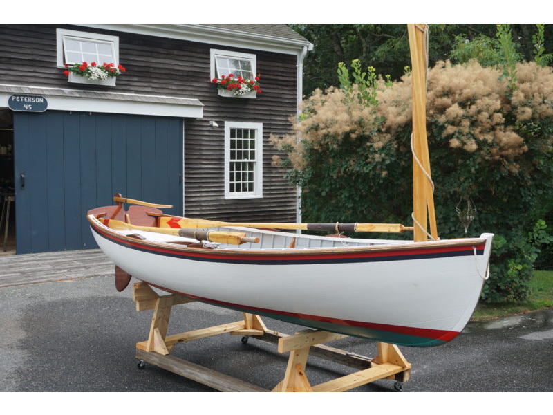 A new, sturdy, roomy vessel for oar and sail. LOA- 12′ 8″, width- 4′ 5″. This classic boat design fully conforms to the specifications set out by the originator Joel White of Brooklin, ME in the 1970s. The hull is carvel-planked (5/8″ planks). A weighted oak centerboard is mounted in a trunk. Finishing touches include varnished white oak, mahogany, teak, and locust plus brass rub rails. Transom and rudder made of solid mahogany. Spars made of clear Sitka spruce and handmade Culler oars are tipped with mahogany. Decking included to keep your feet dry. The standard sail rig is loose-foot using a sprit (no boom to whack you in the head!). Two rowing stations ensure proper trim whether rowing alone or with a paramour. This is a perfect boat for either the novice or experienced sailor of any age. I have received numerous compliments from visitors. Equipment includes boat, mast, sprit, rudder, tiller, centerboard, oars, and brass oarlocks. Note that sail and trailer not included. |