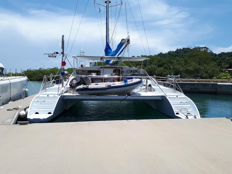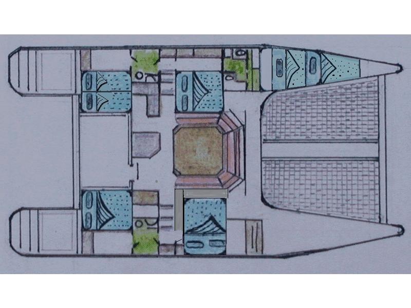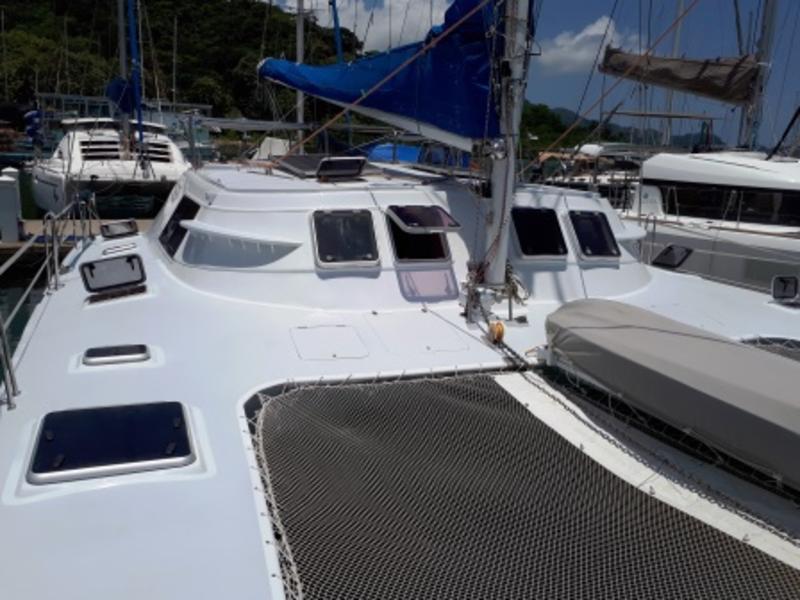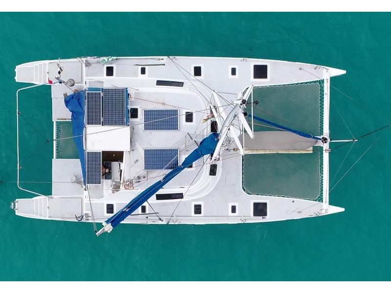 2. DISCRIBTION: 5 double cabins each with hatches and ventilator 3 x electric toilets 2 showers inside, 1 deck shower on starboard hull Refrigeration 270 l fridge (Danfoss water cooled) 70 l fridge, also as deep freezer usable (Danfoss air cooled) Kayak 2 seater SUP (Stand Up Paddleboard) Dinghy 9 ft 5 HP Outboard Dinghy to lift with main sail halyard and the electric winch to the back platform Front net areas and back net areas between the hulls made of Dynema