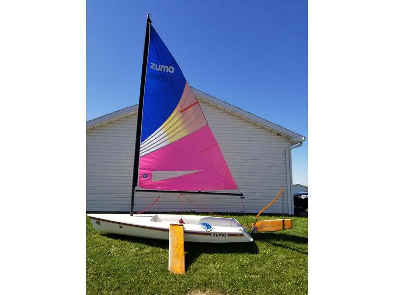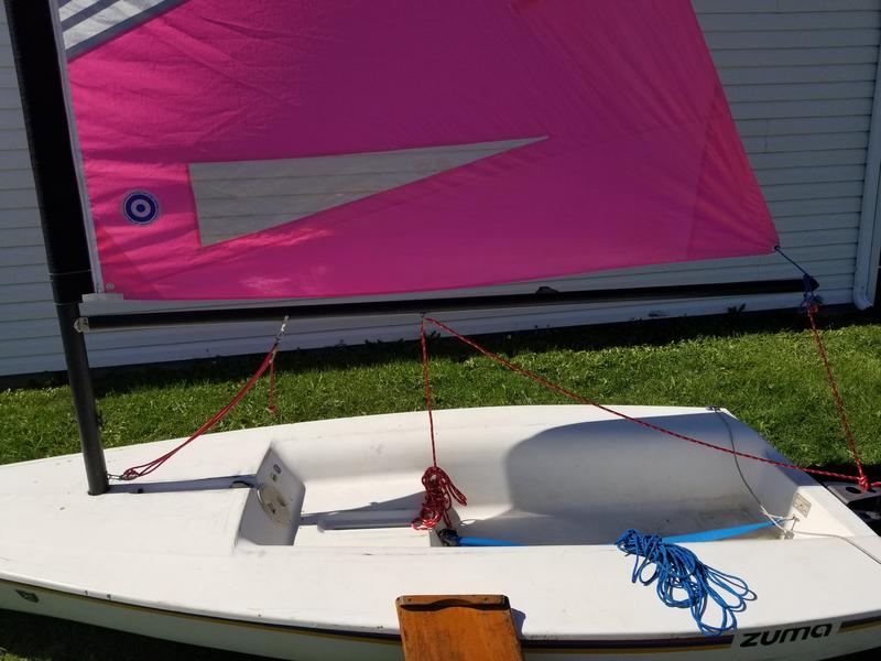 LOA: 12' 9" Beam: 5' Sail Area: 65 square feet Hull Weight: 130 lbs Water-tight port with storage bags Self-draining cockpit Kick-up rudder Zippered and sleeved sail with halyard NO TRAILER - Can be hauled on car top. Very good condition and ready to sail. Will consider delivery if needed.