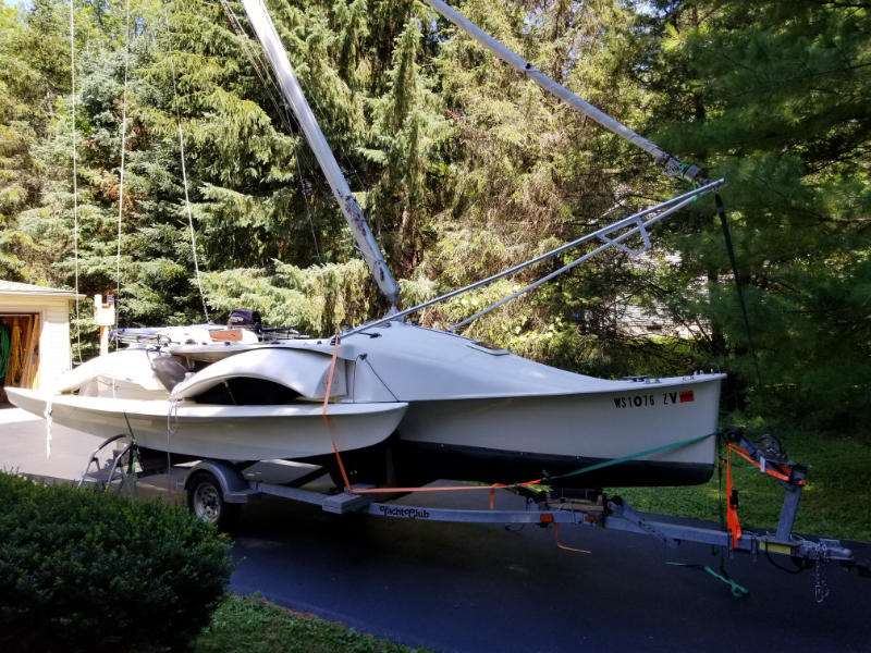Not a kit-boat! Dick Newick design. Foam-core construction. 19' new moon AMAS. Trimaran AMAS swing in to go form 18' beam into 8' beam for trailering. Boat has two cabins, one fore and one aft to sleep one person in each cabin. Cabins have cushions and lights. Mast-raising system build into boat, can be launched by one person. this is a fast stable boat with a large cockpit and trampolines with lots of room to move around. It has a draft of 18" with dagger board down draws 4'.