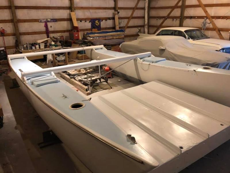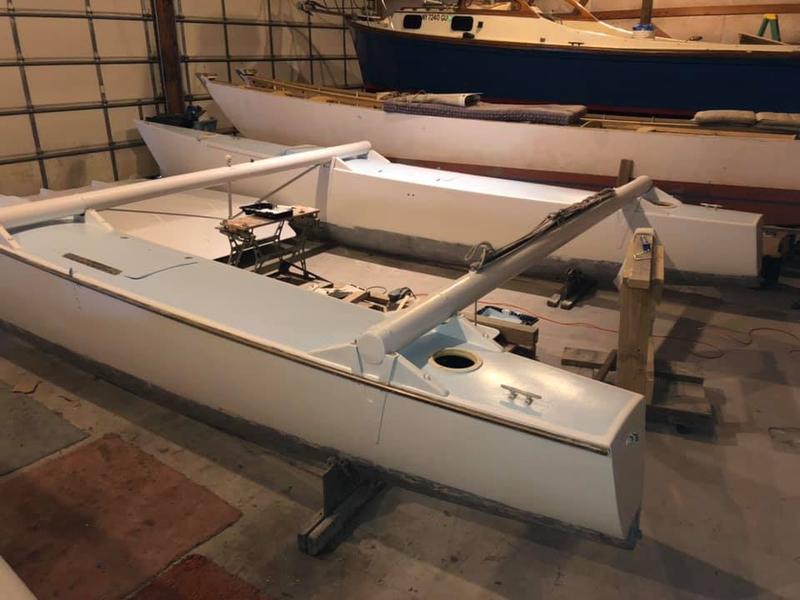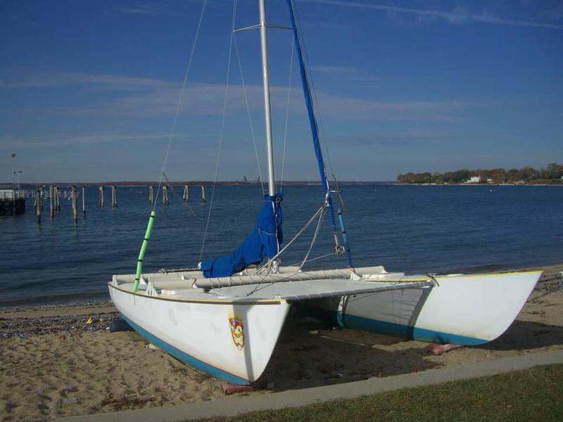 Main sail, roller furling jib. Rig is from a SuperCat 20, Centerboard in each hull, kickup rudders, forward net, motor mount (3hp - 6hp).