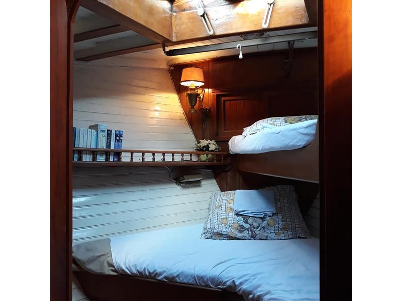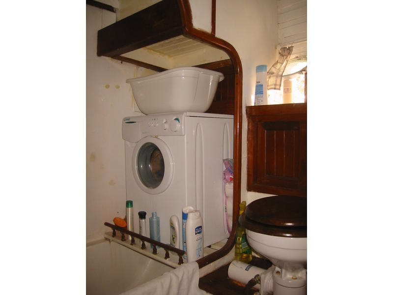 Cabins: After-cabin with extra ladder to the deck, double bed, big loop window, 4 bull's eyes, double sitting banks with extracting table, electric toilet, shower with basin, warm and cool water, mirror, bath tube shower and washing machine, one bull's eye in WC. Front-cabin with up & down berths, skylight, 2 bull's eyes, electric toilet, shower, warm and cool water, mirror, bath tube shower, one bull's eye in WC. 2 berths at saloon with center skylight and 4 bull's eyes,1 berth through passage with 1 bull's eye 1 engine room with 1 bull's eye (main engine, diesel generator.