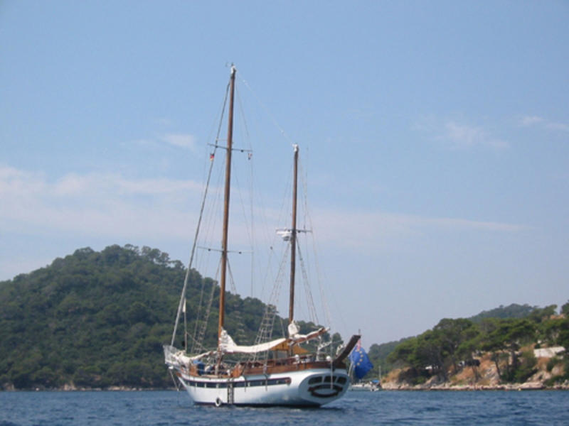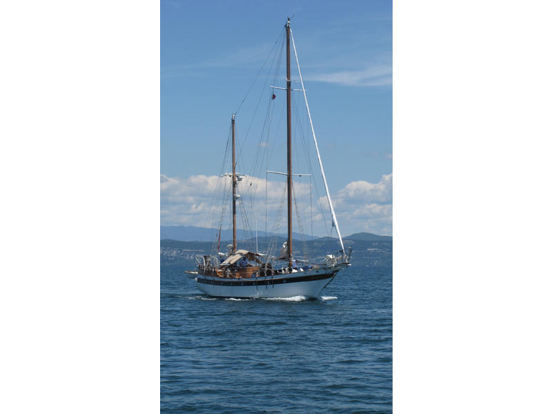 Nautical Instruments: Complete navigation, plotter C80 Raymarine, depth sounder, sumlog, compass, Furuno GPS, 2 radars, Neco autopilot, 2x VHF-radio, wind indicator, rudder display, speed indicator at helm stand, sextant, chart material from the Mediterranean sea, nautical manuals, nautical belongings 80" plotter with world-wide chart chips and radar, 2 rotation measuring instruments. Radio: SSB trans-receiver marine band & ham radio, 1VHF trans-receiver on helm, 1VHF trans-receiver on chart-table, Flat TV with satellite reception, radio with stereo. Security: Foghorn, life raft, signal rackets, signal pistol, life vests. Sails: Main sail: 70 qm new Foresail: 20 qm new Genoa: 50 qm (with electric roll-reff system) Mizzen: 22 qm new Accessories: 4 deck skylights, swimming ladder, sea railing, folding gangway, davits, pressure water equipment, hot water boiler 30 liters with 220 v, extinguisher, elec.heaters, 1 washing machine,2 ventilators, beddings, hammock, dinghi with Suzuki out-border 2,5HP, fenders, gas cooker with 2-flammig, 1 elec. ceramic glass cooker, 1 elec. oven, double sink, 2xrefrigerators 12v, microwave, water pipe, different cables for land connections, barometer, ship clock, thermometer, barograph, humidity meter, extended tools and spare parts, ropes, bedclothes, blankets, extensive kitchen accessories, 1 complete diving equipment with diving suit, snorkel, masks, air bottle aqua lung aspirator, dept watch, lead belt, flippers etc.