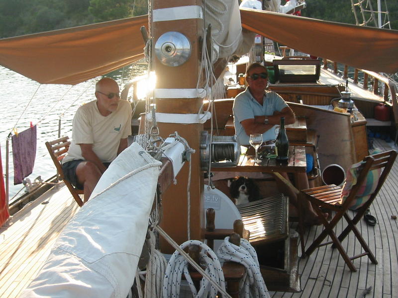 Deck layout: Center cockpit, belaying pin rail around main mast, sitting banks with cushions, folding gangway, deck house, 4 sky-lights 30 sqm teak deck (total renewed 2003) 9 manual winches 1 electric winch for sail, dinghy lifting, 1 aft deck house for ropes and cables 1 storage bench at center cockpit, 1 storage bench at front bridge sitting, 1 folding table on deck for 4 persons, 2 folding chairs on deck, 1 fixed folding table for 2 persons at center cockpit, 1 strong winter owning, 1 summer cruising cockpit owning.