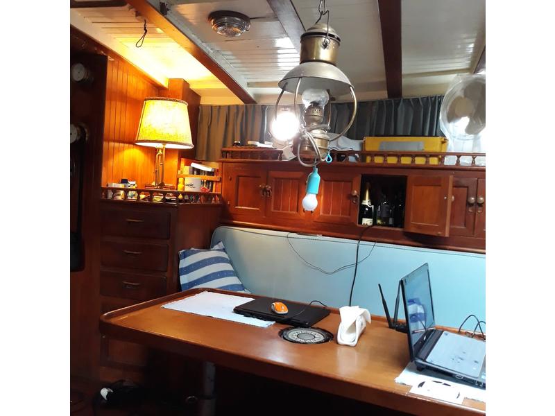 Engine: The engine is a Ford Lehman six-cylinder 120hp diesel with a Borg Warner 2.5 2.1 gearbox which drives a three-blade prop. Working hours are 1900 hrs. Cruising speed under engine 6kn, max 9kn. Navigation equipment: Furuno radar, Raymarine radar, Neco echo sounder, Neco log, 2 Icom VHF, Raymarin GPS, Neco autopilot, Raymarine color plotter c80, Icom IC-726 SSB Ham frequencies. Electrics:12v and 220v throughout,4x140 A/H deep cycle batteries(2019),1 battery charger 40A/H(2019),1 diesel generator 5 kw Paguro 4000(approx.100 hours),1 gasoline generator 2kw, Floodlight over deck,3 anchors with 2xchain(60m&90m), anchor store, elec. anchor winch,1 bilge electric pump & 1 spare part.