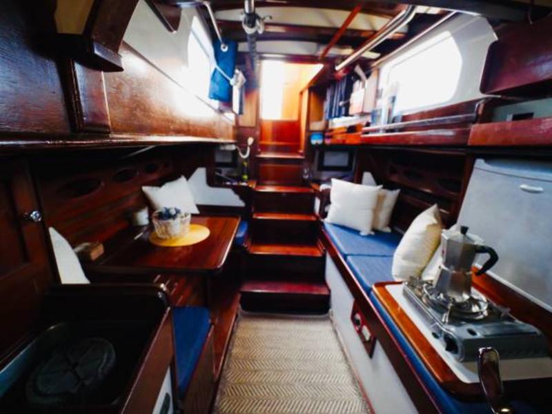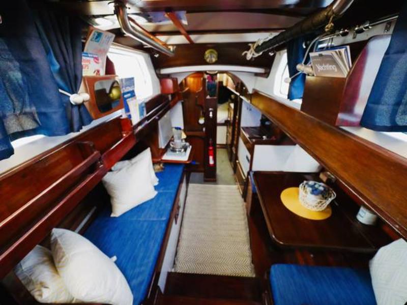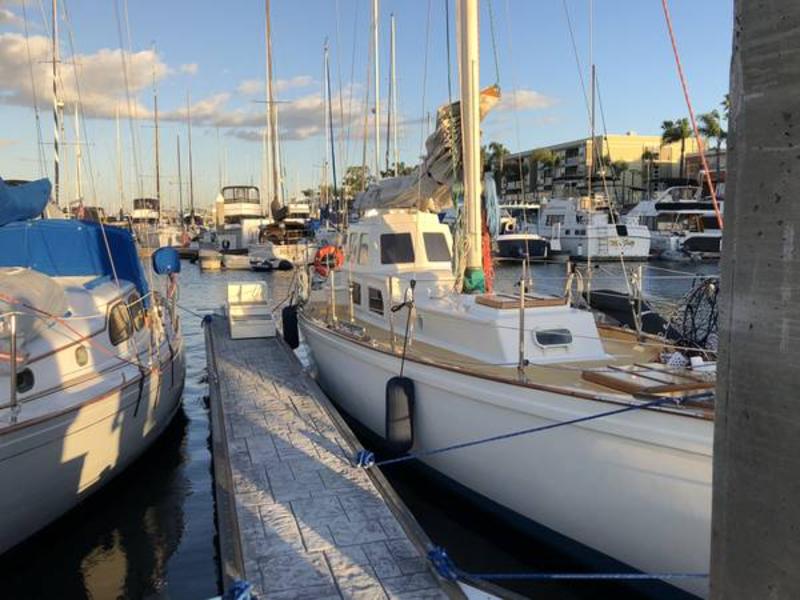 Hull Profile: nearly plumb canoe stem, wineglass hull, full keel with pintle and gudgeon attached rudder, raised raked transom stern, aft helm lazaretto / doghouse & cockpit, and trunk cabin.