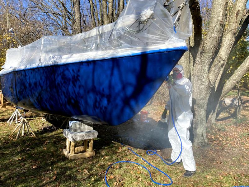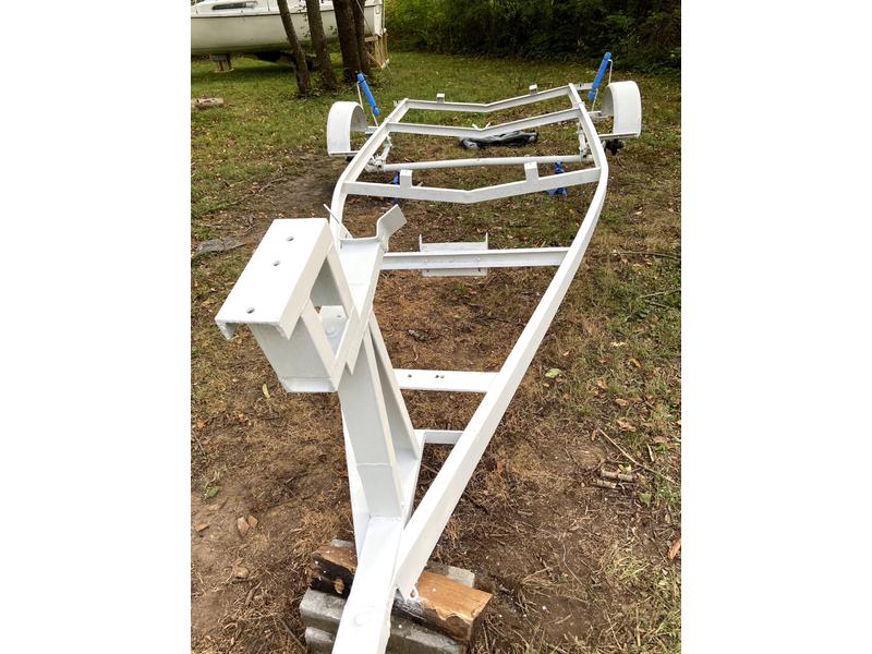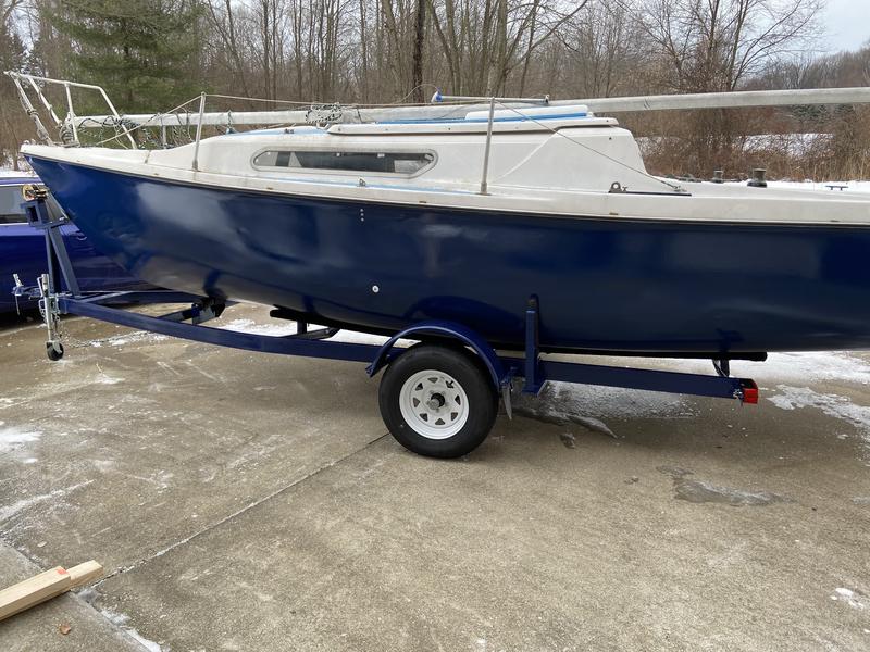 Here's what we've done so far: 1. The Hull-Sanded and Repainted with marine grade PPG paint, resealed hull to deck transition. 2. Paid to have Drop Keel-Completely Refurbished (cracked and rusted), added new keel lines and winch for drop keel. 3. The Trailer (1996 trailer)-Completely Refurbished(wire brushed, marine grade rustproof primer, PPG marine paint, new rollers, carpeting, new electrical system & conduits, new bearings, new hubs, new wheels, etc.)