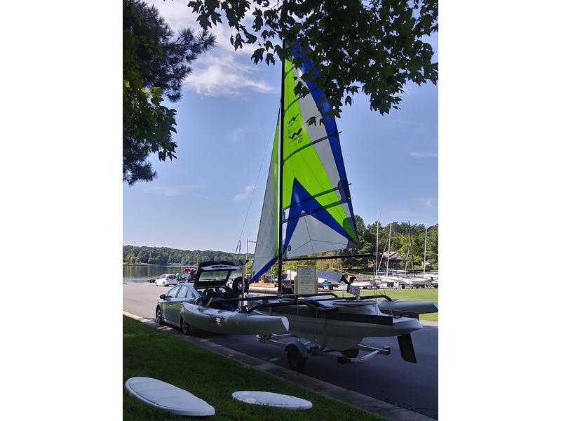 Windrider 17 trimaran in excellent shape. 2015 WR17 trailer, WR motor mount, 2020 Minnkota electric motor with deep cell battery, WR17 mast raising system and WR 17 storage shell and pockets.