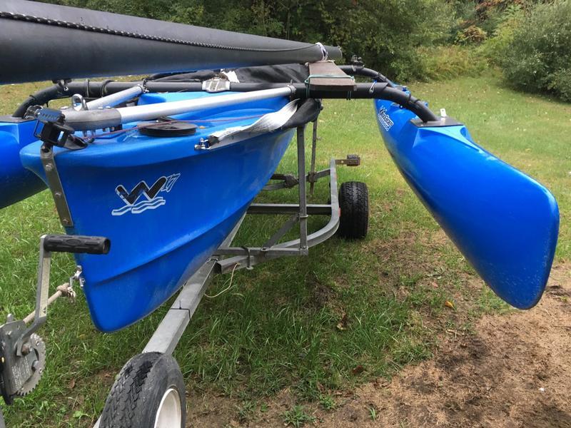 Rare BLUE polymer trimaran hulls and fresh-water only boat, never seen salt. Good condition, comes with benches and small outboard motor mount bracket (outboard is NOT included). Hot-dip galvanized trailer with combination beach and highway tires (tows great at 70 mph!!), custom mast-raising system, good condition sails....._/)*.... |