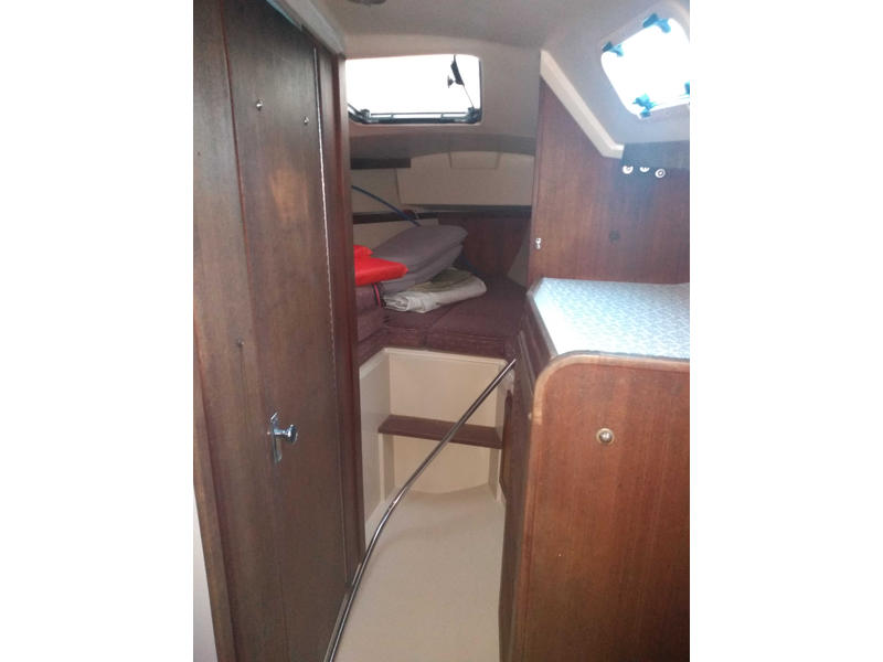 Cabin V berth Port: Head w/ shower Starboard: Hanging locker and drawers