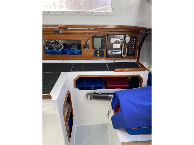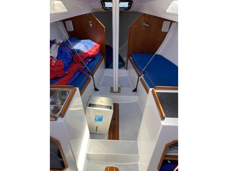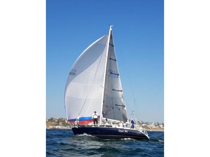 in 2010 Trust Me was completely rebuilt by her current owners with no expense spared: Deck and hull were resurfaced, reinforced, and re-painted, all new tracks and hardware were installed, the standing and running rigging were replaced, the mast and boom were repainted, and the interior was given a complete makeover. She has a full complete compliment of sails, and her carbon spinnaker pole accommodate both symmetrical and asymmetrical spinnakers. |