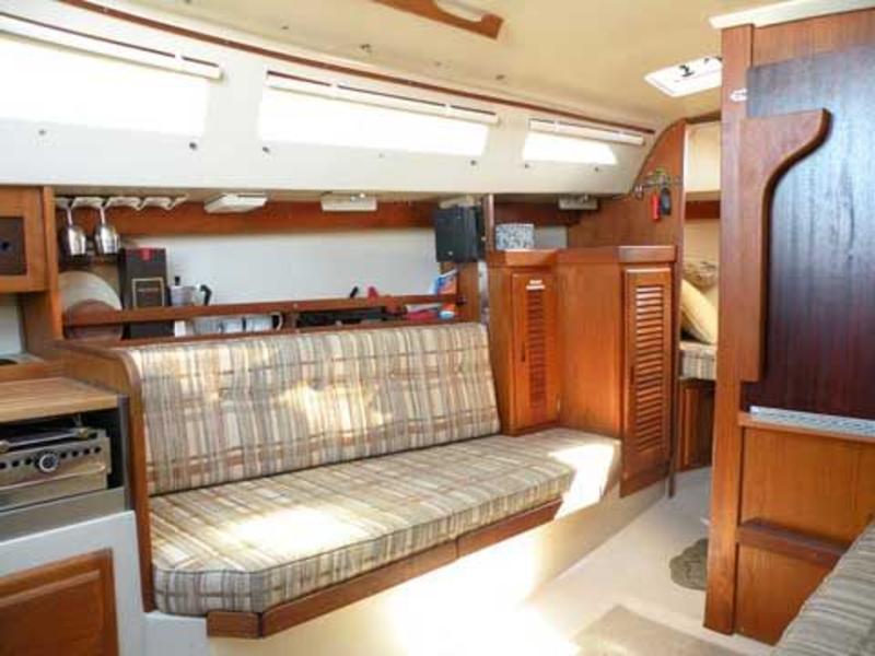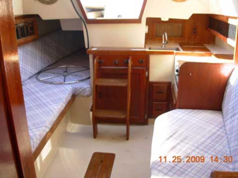 A wide companionway connects the roomy main cabin/galley (6'headroom) to an efficient and comfortable cockpit large enough for socializing. Includes a stern gate with swim ladder. The V-berth, quarter berth and pull-out settee provide sleeping for 5.