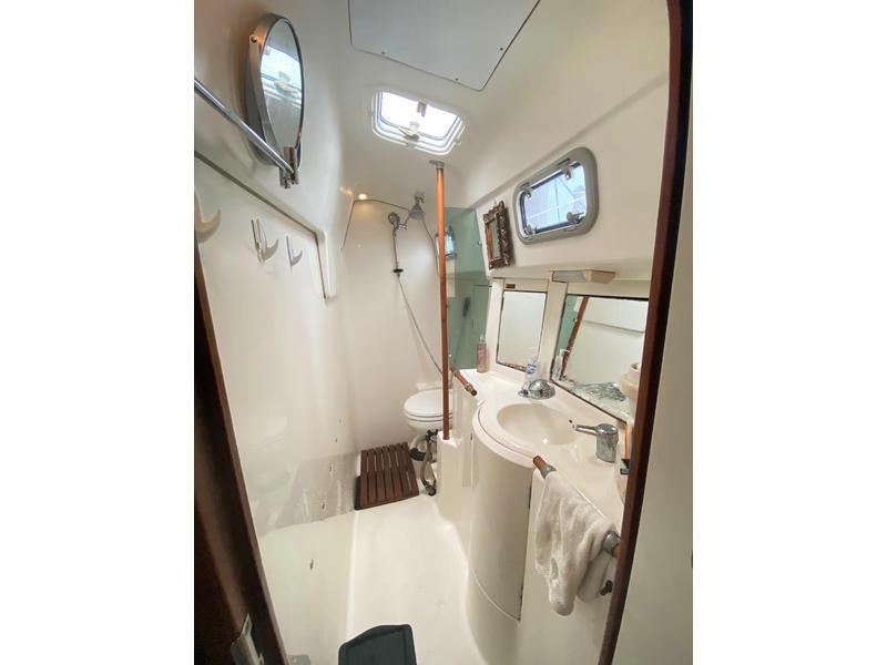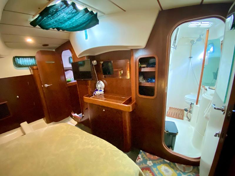 The owners cabin aft (a very popular feature of these yachts) boasts a huge amount of space you would normally only expect on a much larger yacht, with its centerline double berth, vanity unit and excellent storage. There is a generously sized en-suite heads compartment with separate shower stall.