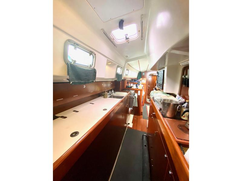 An attractive yacht with nice lines when viewed from ashore. The deep secure feeling centre cockpit with fixed screen/sprayood/bimini combination gives excellent protection from the elements and the cutter rig and in-mast furling mainsail give a versatile sail plan and good performance.