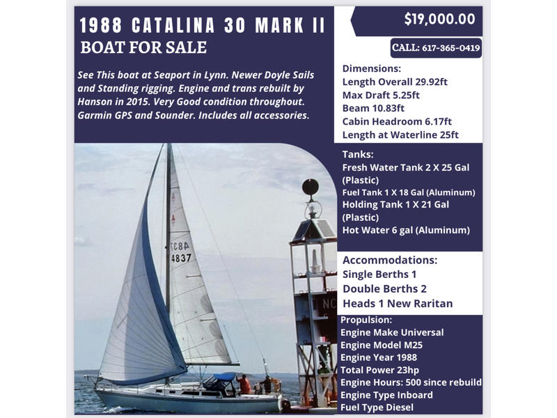 1988 Catalina Mark II 30' Very good condition. Includes: Dodger, Bimini, LNG range, stove, VHF radio, grill. Doyle sails and standing rigging. Garmin GPS and sounder. Engine and trans rebuilt by Hanson in 2015. Very good condition throughout. Well maintained. Includes all accessories.