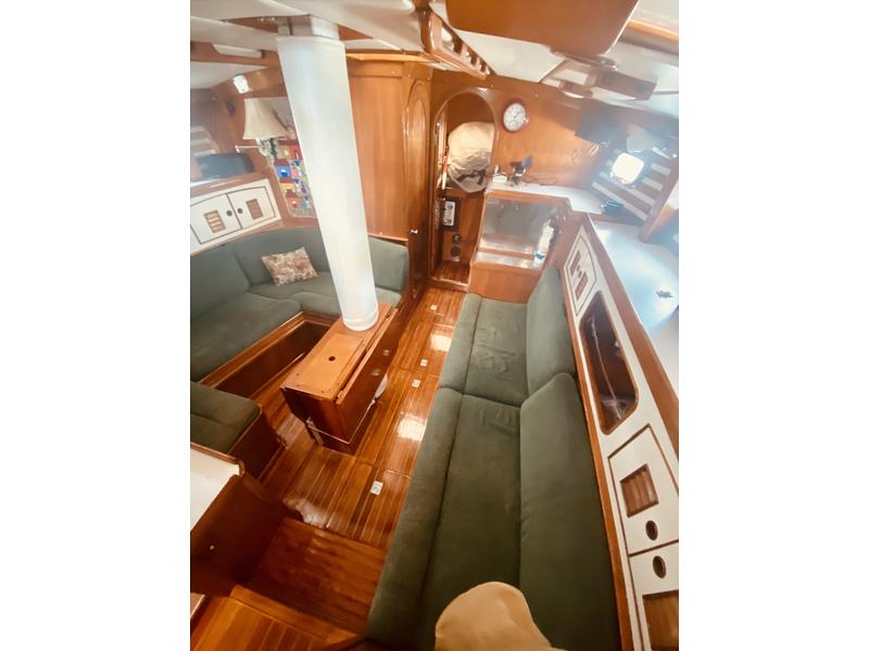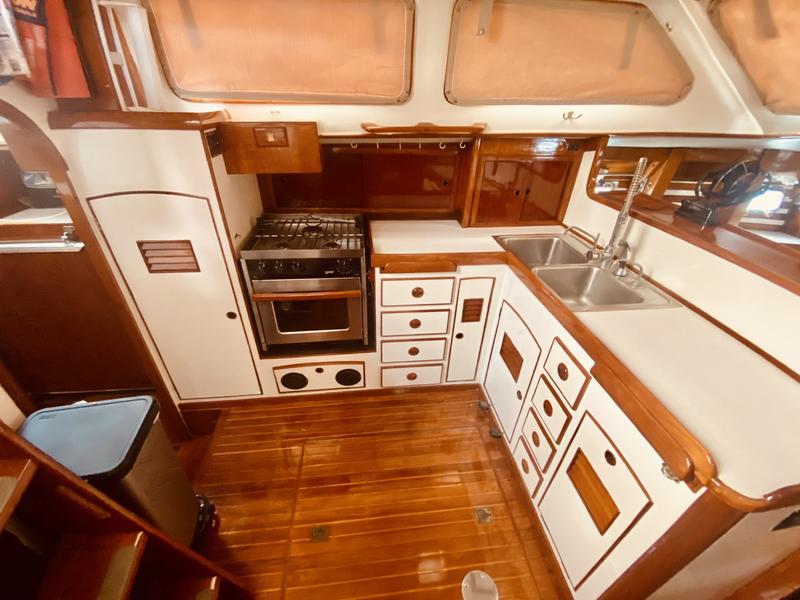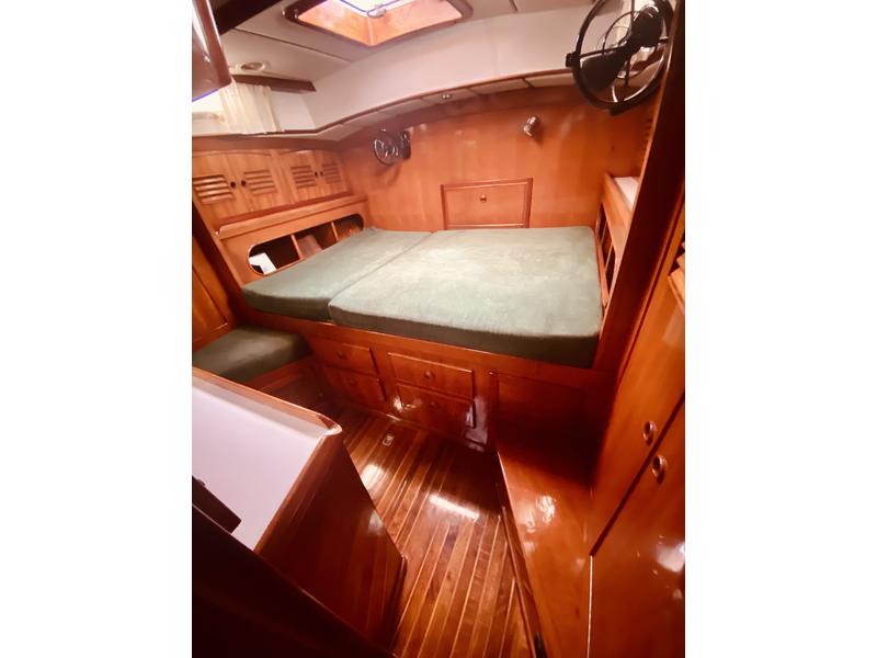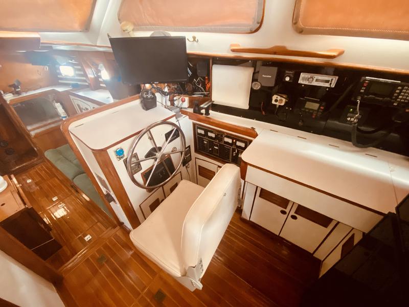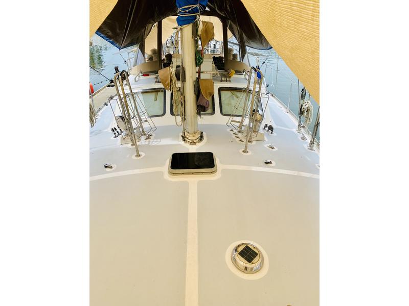Topside and full forward is an adequate anchor control system with a double roller. There is a welded stainless steel bow pulpit with double stainless steel wire lifelines and welded stainless steel stanchions leading full aft to a welded stainless steel stern pulpit and welded stainless steel arch with solar panels. There is a stainless steel dinghy lifting and storage system full aft. There are boarding gates to port and starboard and aft. Full forward is and adequate anchor control system with double rollers and 12 volt windlass. There is a large deck area leading to the raised cockpit. The sailing cockpit is large with storage below and easy access to the companionway. Below decks and full forward is a guest suite with a full V berth, with storage above and below. There is a port side door for ensuite access to the forward head. Moving aft there is the forward head access to port with a manual toilet, stainless steel sink and shower. Continuing aft is the large salon with a straight settee to starboard and a large U shaped settee to port with a fold down dining table. Moving aft and up two steps there is a lower helm station to starboard with steering, navigation instruments and electrical panel. Directly across to port is the L shaped galley with a double stainless steel sink, 3 burner propane marine grade stove/oven and a large standup 110/12 volt refrigerator/freezer. Continuing aft to port is a hallway with storage lockers and a 110 volt freezer leading to the captain suite. The captain suite has a full width queen berth and storage lockers to port and starboard.MUCH MORE!