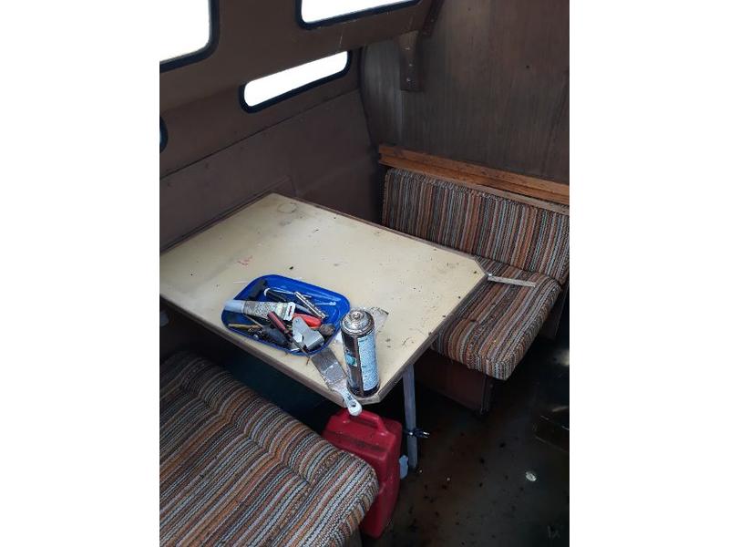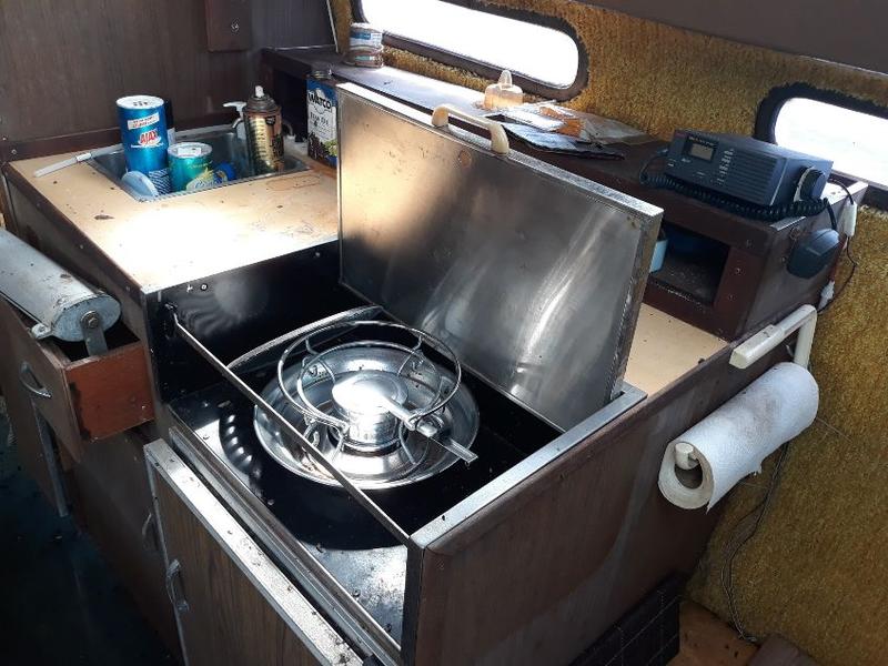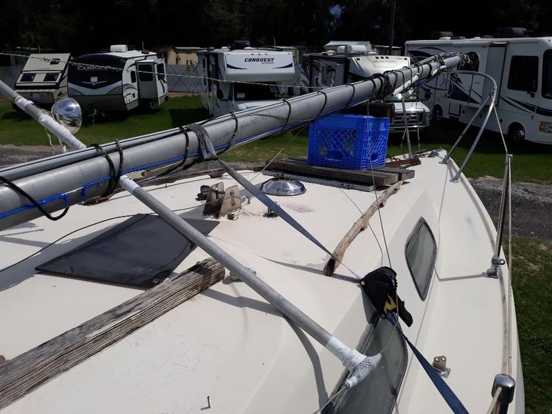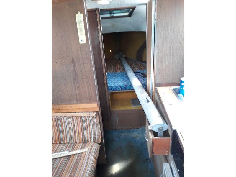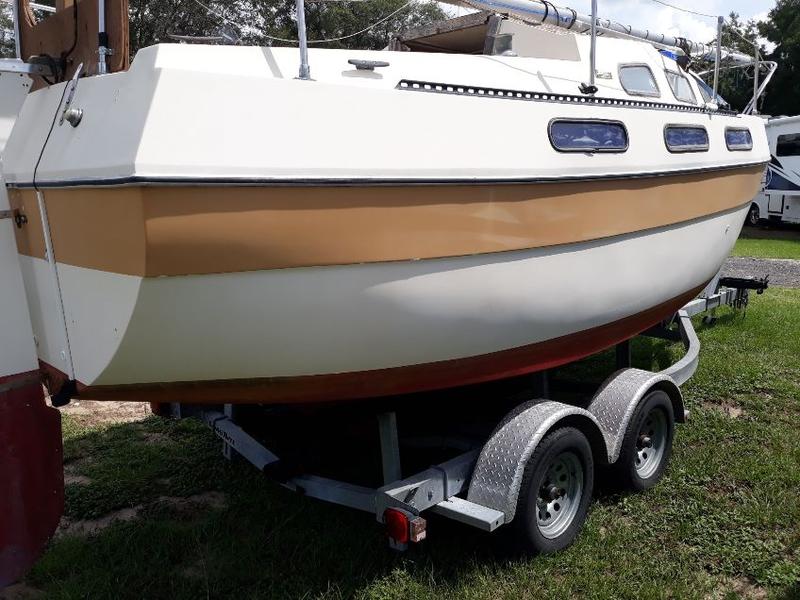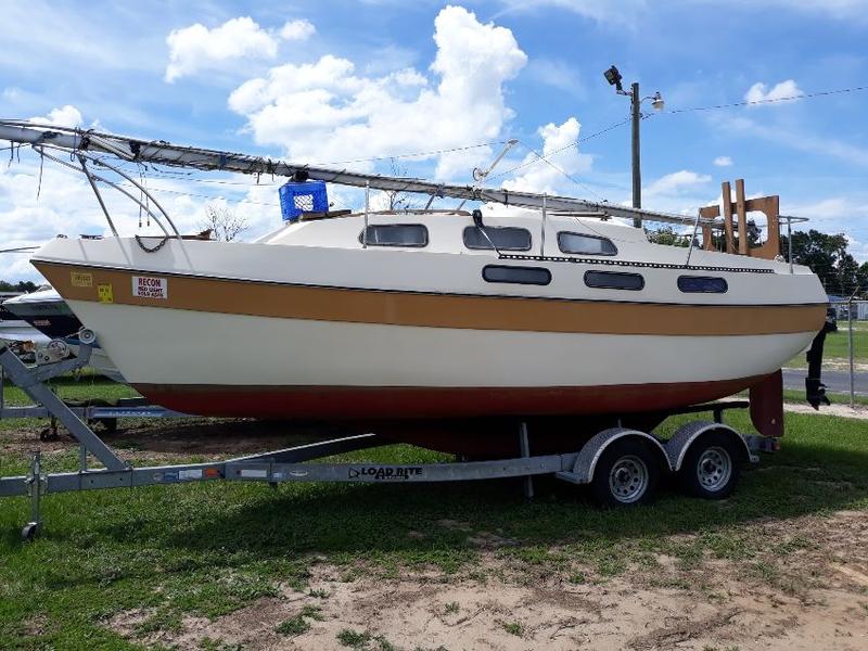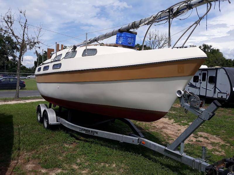1974 Bayliner Buccaneer 23 Sloop Sailboat with 2013 Load Rite dual axle trailer. Fixed shoal draft keel, roller furling head sail, detachable rudder with tiller, Galley with alcohol stove, dinette table/ bead, head, bow pulpit, forward opening hatch, 9.9 Mercury O/B. Good Bones, but this is a Project Boat, trailer in good shape.