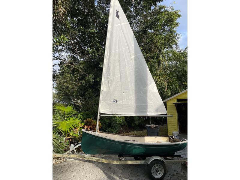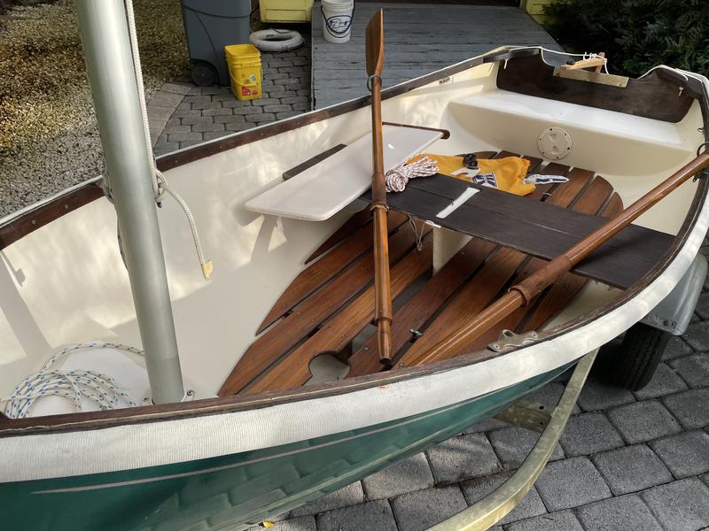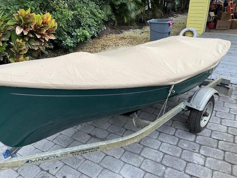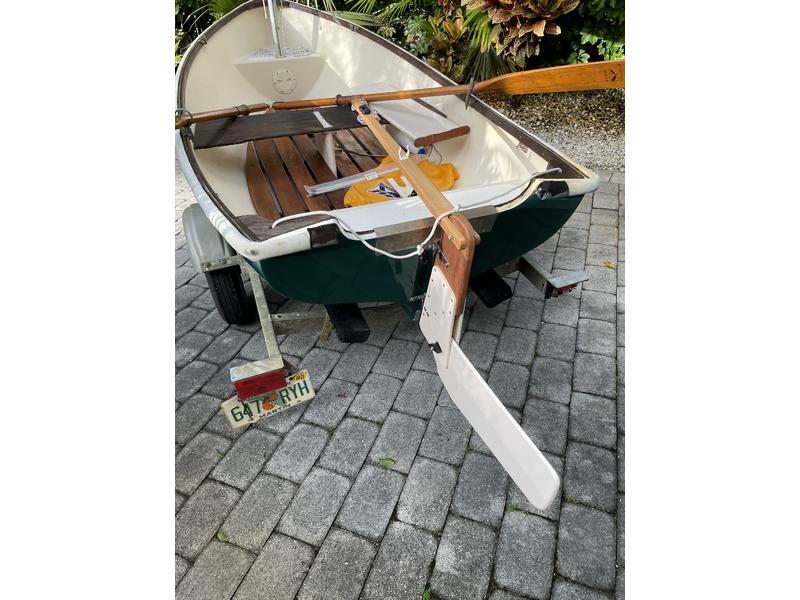Johannsen 10 Sailing / Rowing dinghy original dark green gelcoat in excellent condition complete sailing rig. Aluminum mast, boom, sail, rudder, daggerboard, boat has never been sailed teak floor insert, easy to remove tan canvas boat cover 7 ft wooden oars with bronze hardware and leather SS rear motor mounting plate elvstrom bailer makes dinghy self bailing boat lifting U bolts boat and accoutrements in excellent, ready to use, near new condition 1986 model in time capsule condition serial # B0030 located in palm city fl trailer not included, boat fits in back of pickup, 10' x 53" wide, 135 pounds |