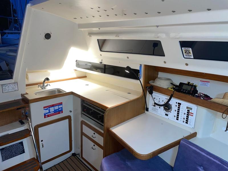 -Full Galley with pressurized hot/cold water sink, two burner gimbaled propane stove, and refrigerator.